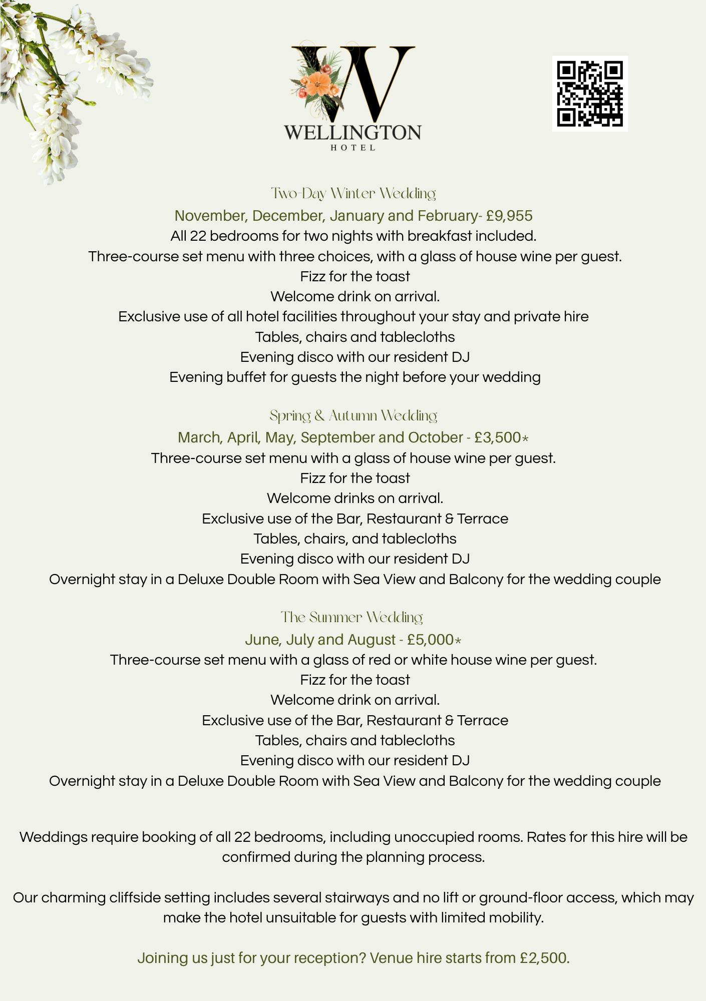 Celebrate your special day at The Wellington Hotel, where timeless elegance meets stunning seaside views, creating the perfect backdrop for your wedding. Nestled in the charming town of Ventnor, our hotel offers an intimate and romantic setting that’s ideal for both small, personal ceremonies and medium sized celebrations.